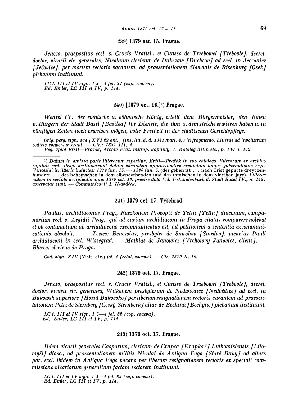 III et IV, p. 114. 240) [1379 oct. 16.]1) Pragae.