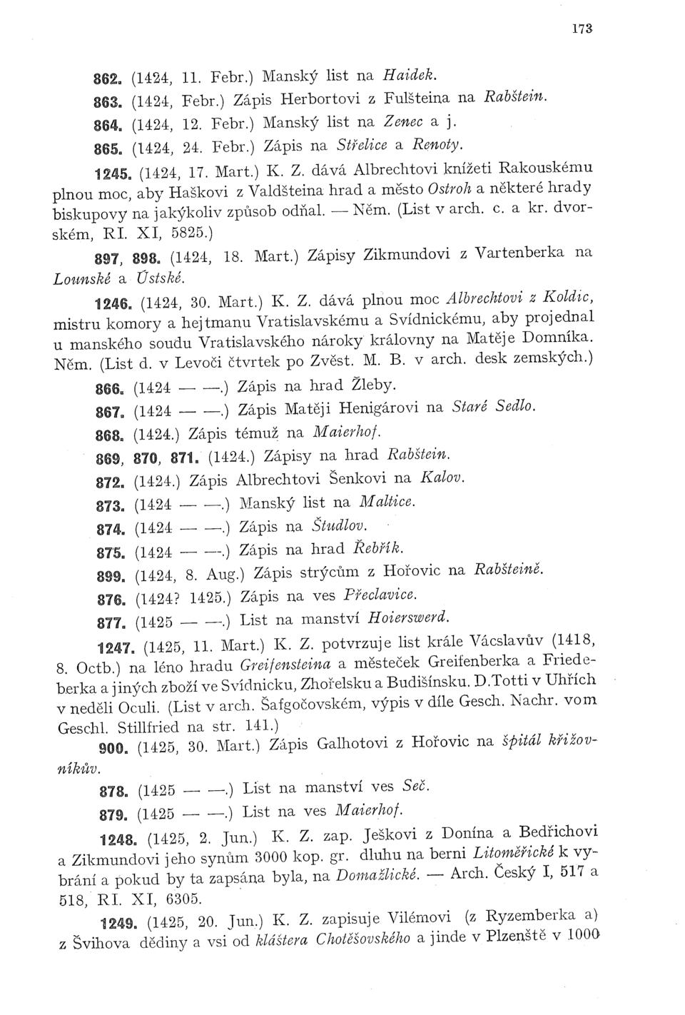 ském, RI. XI, 5825.) 897, 898. (1424, 18. Mart.) Zápisy